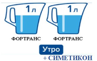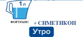 Вечером накануне дня обследования принять первую порцию раствора препарата Фортранс, утром в день обследования — вторую порцию раствора, при этом в последний стакан раствора добавить пеногаситель симетикон в любой жидкой форме (не таблетки и не капсулы!) — ¼ флакона (эспумизан, боботик, сабсимплекс).